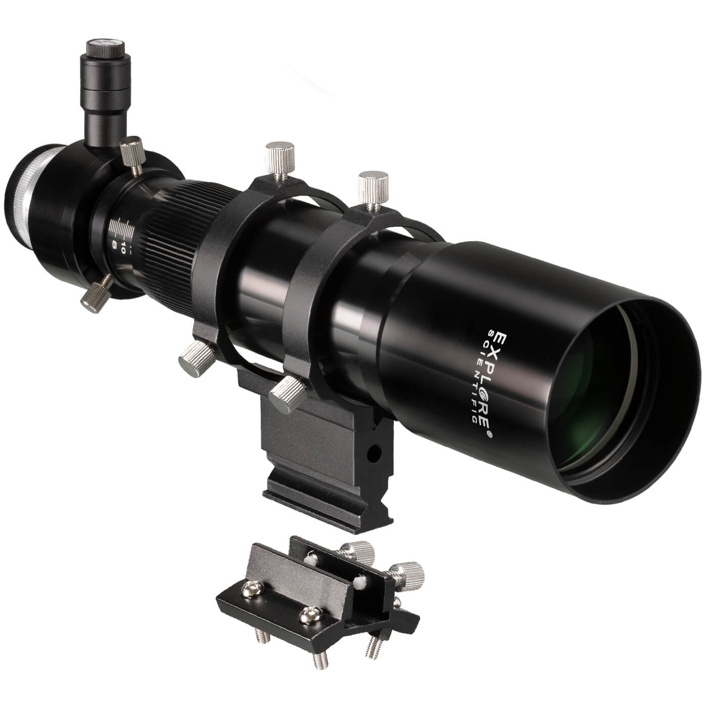 Celá montáž dalekohledu je vyrobena z hliníku, který zaručuje odolnost, nízkou hmotnost a dlouhou životnost. Držák hledáčku je kompatibilní s mnoha běžnými typy dalekohledů, včetně Explore Scientific, Bresser Messier a dalších. Pokud stávající hledáčková patka není kompatibilní, je v balení přiložena náhradní universální patka, kterou lze k tubusu dalekohledu přichytit čtyřmi šrouby M5. Vzdálenosti otvorů patky jsou 31,7 mm jak v podélné, tak v příčné ose. Šest velkých seřizovacích šroubů s rýhovanou hlavou umožňuje snadné a přesné nastavení polohy hledáčku i ve ztížených podmínkách. Všechny seřizovací a upínací šrouby jsou opatřeny plastovými hroty, které chrání povrch dalekohledu před poškrábáním při montáži i demontáži.