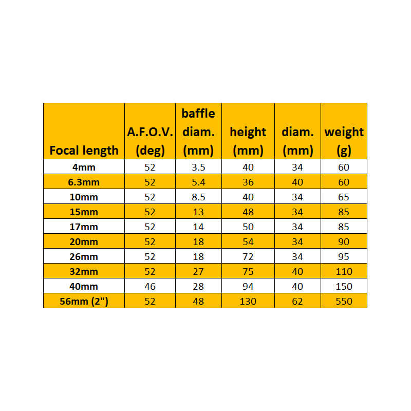 - 52stupňové zorné pole (45° u 40 milimetrového okuláru) – výrazně širší než Kellnerovy a standardní Plösslovy okuláry