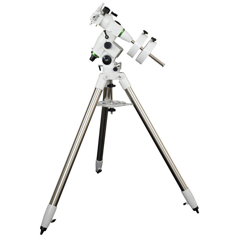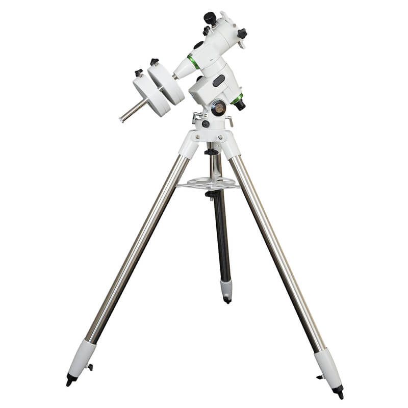 Montáž EQ5 je postavena na masivním ocelovém třínohém stativu s nohami o průměru 44 mm, které zaručují mimořádnou stabilitu i při práci s těžšími dalekohledy. Výška stativu je plynule nastavitelná v rozsahu 85 až 121 cm, takže si každý pozorovatel může pohodlně nastavit pracovní výšku. Nohy stativu jsou kovové, průměr 1,75″, což přispívá k celkové tuhosti celé sestavy. Samotná hlava montáže disponuje jemnými mechanickými pohyby v obou osách - rektascenzní i deklinační - díky nimž lze přesně navádět dalekohled na pozorovaný objekt bez nepříjemných záškubů nebo přeskakování. Součástí montáže je také vodováha pro snadné horizontální vyrovnání stativu před zahájením pozorování.