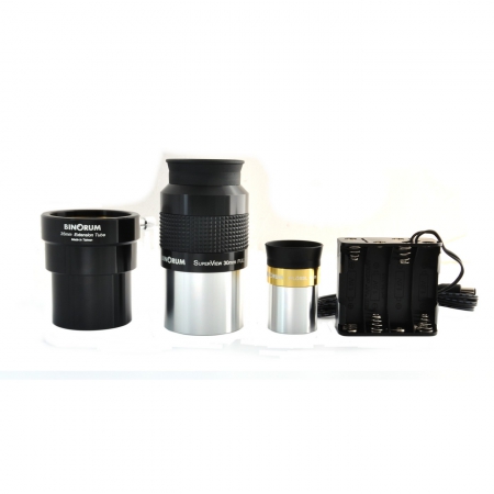 Velmi kvalitní příslušenství: např. 2″ 30 mm širokoúhlý okulár typu Erfle SuperView (zvětšení 42x), 8x50 achromatický hledáček, 9 mm kvalitní Plössl (zvětšení 139x).
