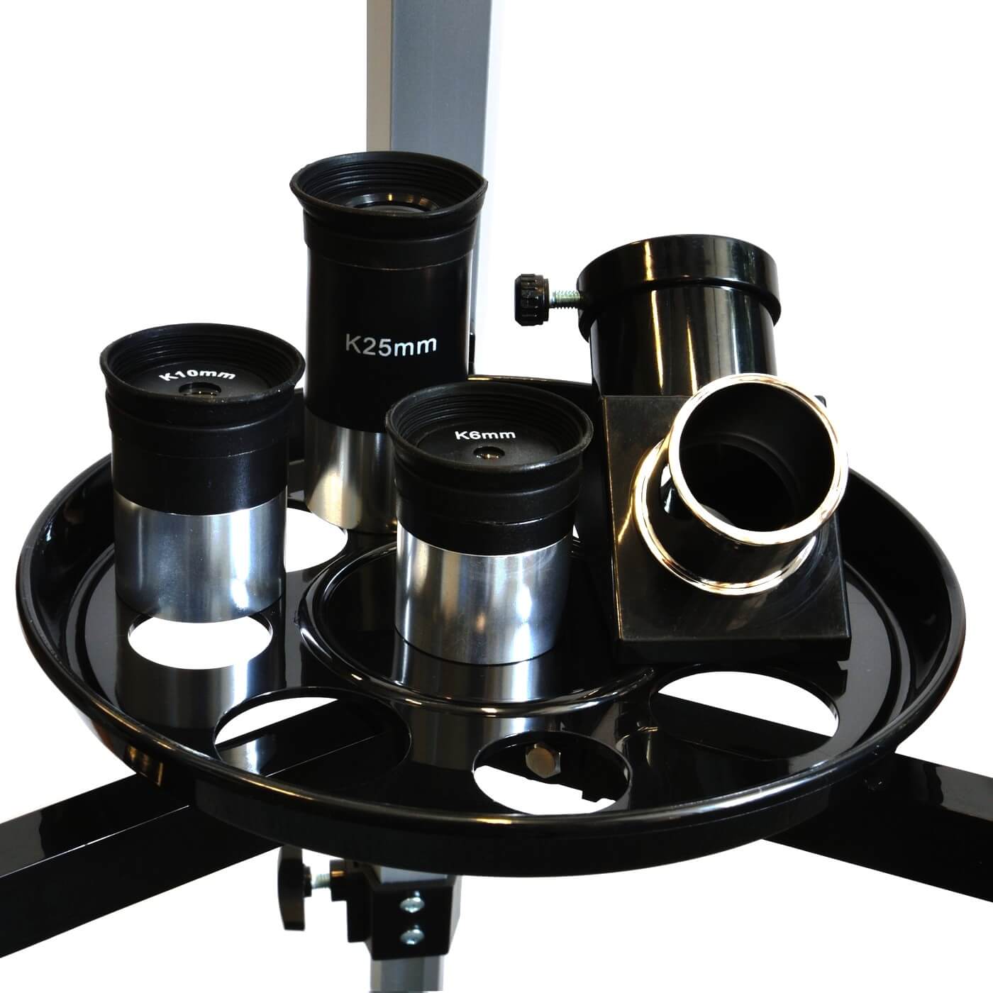 Lehký hliníkový stativ je výškově nastavitelný v rozsahu 80–120 cm, montáž dalekohledu je azimutálního typu – tedy tubus dalekohledu se otáčí zprava-doleva a nahoru-dolů. Součástí balení jsou tři kvalitní okuláry pro zvětšení v rozmezí od 28násobného do 117násobného a optický hledáček ("zaměřovač").