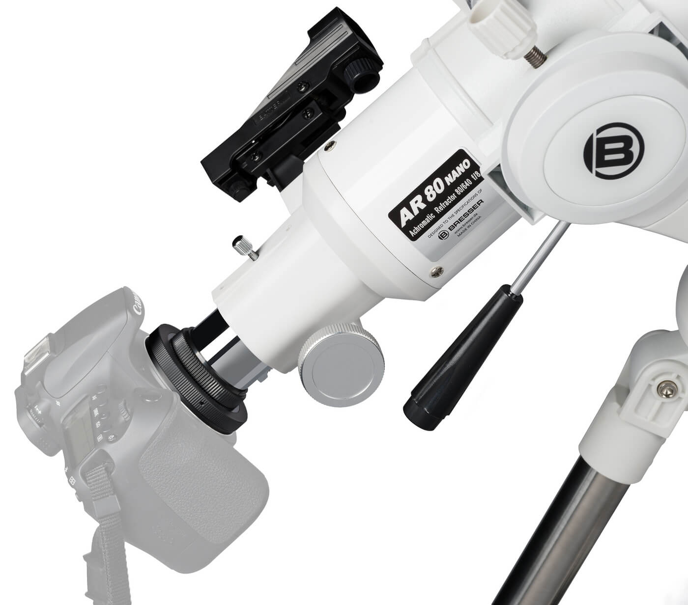 Čočkový dalekohled s achromatickým objektivem o průměru 80 mm s ohniskovou vzdáleností 640 mm. (f/8) s antireflexními vrstvami. Dalekohled je upevněný na jednoramenné vidlicové azimutální montáži "Bresser NANO" vybavené rukojetí pro snadnější ovládání dalekohledu. Ocelový stativ s výztuhou, která zároveň slouží jako odkládací stoleček pro příslušenství, je možné výškově nastavit.