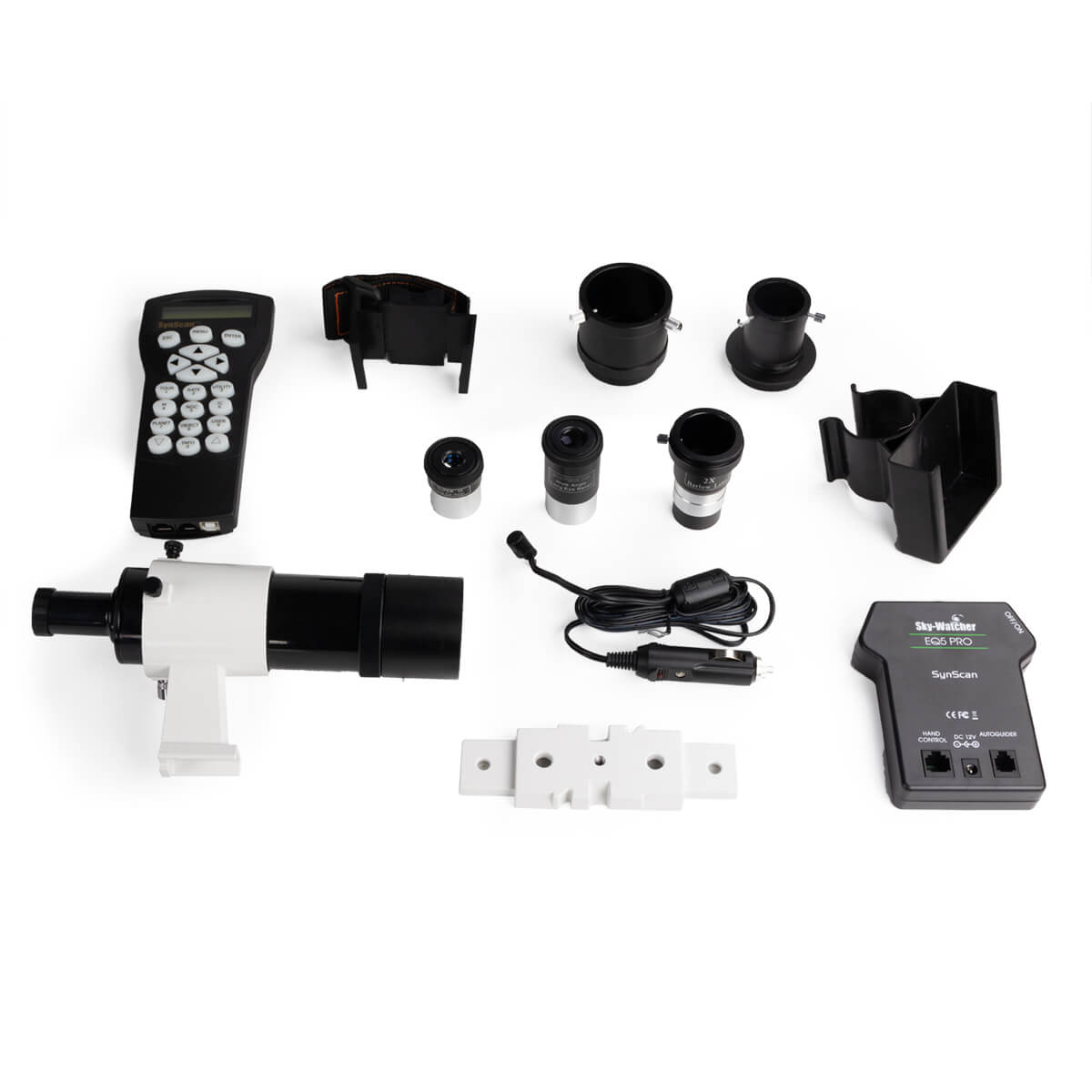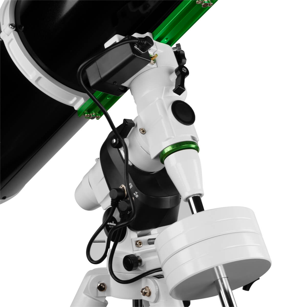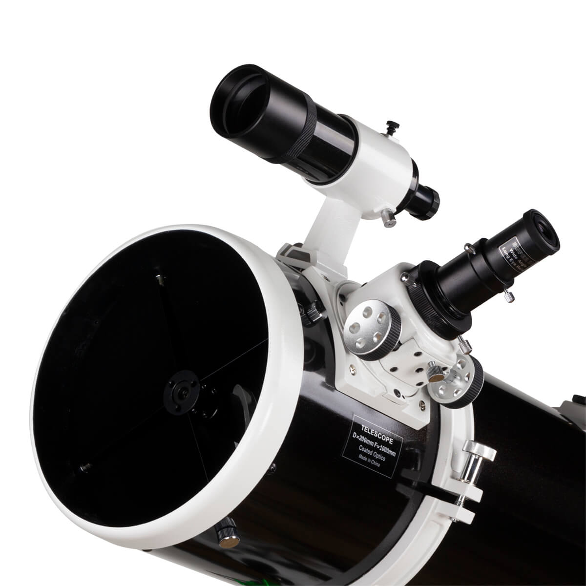 Zrcadlový dalekohled typu Newton 203/1000mm, 8”, světelnost f/5. Parabolické zrcadlo, výstup 2”, s redukcí na 1.25”. Dva okuláry Plössl 25 a 10mm (40x a 100x) se zorným polem 50°. Klasický hledáček 9x50. Těžká německá rovníková computerizovaná montáž GEQ-5 PRO SkyScan GoTo s ovladačem na výškově stavitelném stativu s 1.75” stojnami a odkládací plochou na příslušenství. Napájení 12V (klidový odběr min. 1.5A). Ve výbavě montáže je zabudovaný polární hledáček a 2 protizávaží 5.5kg.