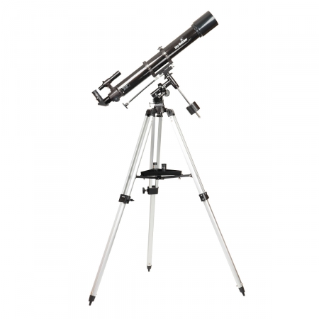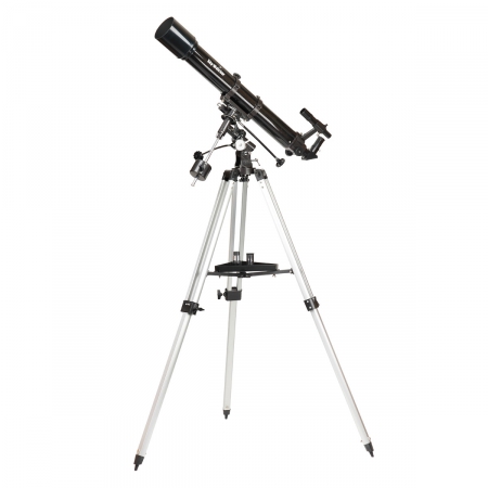 Refraktor f/10, 90/900mm na německé rovníkové montáži, achromát, výstup 1.25” s T2 adaptérem na připojení fotoaparátu, zenitové zrcátko 90°, okuláry SUPER 25mm (38x) a 10mm (90x), hledáček 6x30 nebo Star Pointer. Čočkový dalekohled, umožňující základní astronomická pozorování zejména Měsíce, jasných planet, dvojhvězd a některých jasnějších objektů vzdáleného vesmíru. Rovníková montáž umožňuje snažší pozorování nebeských objektů - po správném ustavení a dokoupení hodinového stroje automaticky sleduje nastavený objekt.