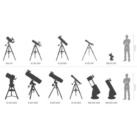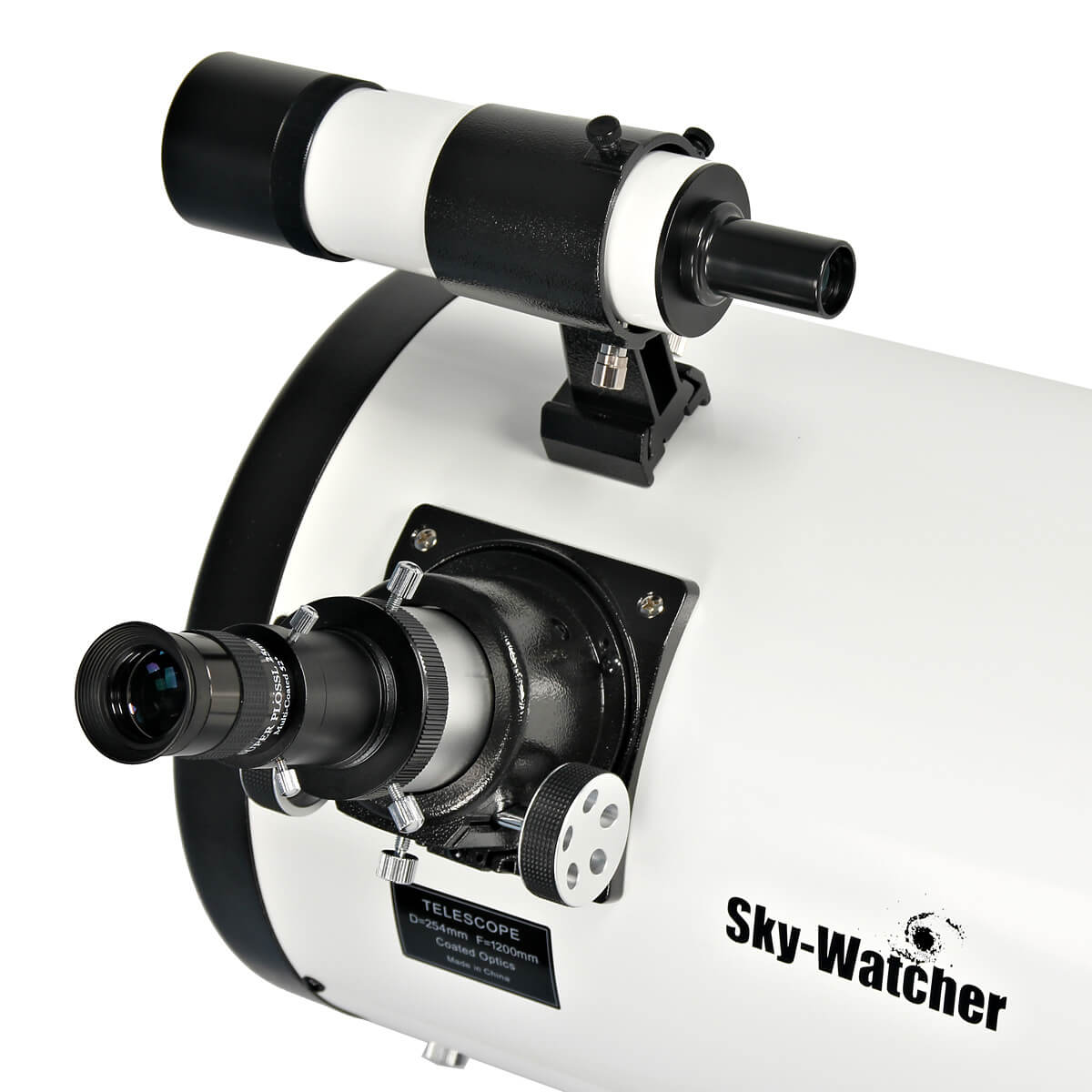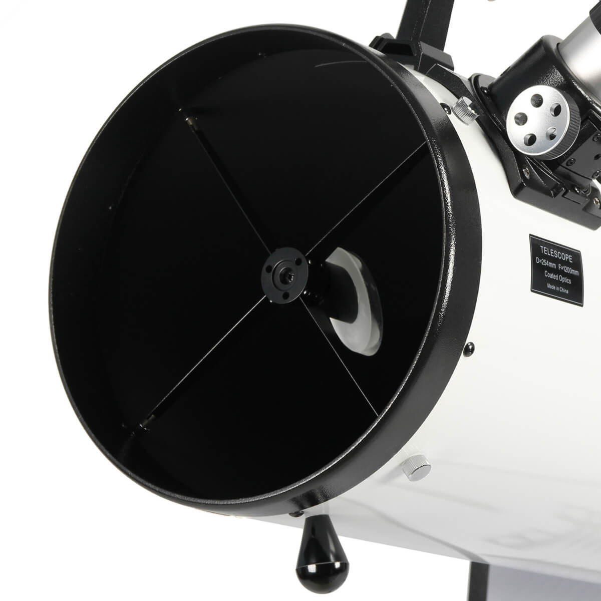 Newton 254/1200mm, 10”, f/4.7 Dobsonova azimutální montáž s azimutálním posuvem na nylonových blocích. Výšková aretace/stavitelný přítlak přes axiální ložisko. V základní výbavě je ložiskový okulárový výtah typu Crayford s výstupem 56mm, opatřený redukcí 56mm/2” a 56mm/1.25” doplněnou o T-závit. Hledáček 9x50, primární zrcadlo - Pyrex s přesností 1/6-1/8 lamba (minimálně).