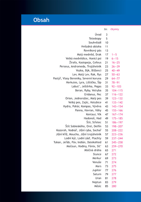 V dalších kapitolách naleznete mnoho podrobných informacích o samotné nebeské sféře, 280 objektech k pozorování, a dále komentáře a fotografie. Jsou zde jedinečným způsobem popsány planety sluneční soustavy a jejich oběžnice, mlhoviny a hvězdokupy v hlubokém vesmíru, spolu s doporučeními ohledně jejich prohlížení, nechybí informace o tom, jak je najít, a o nejvhodnějším teleskopu pro tuto činnost.