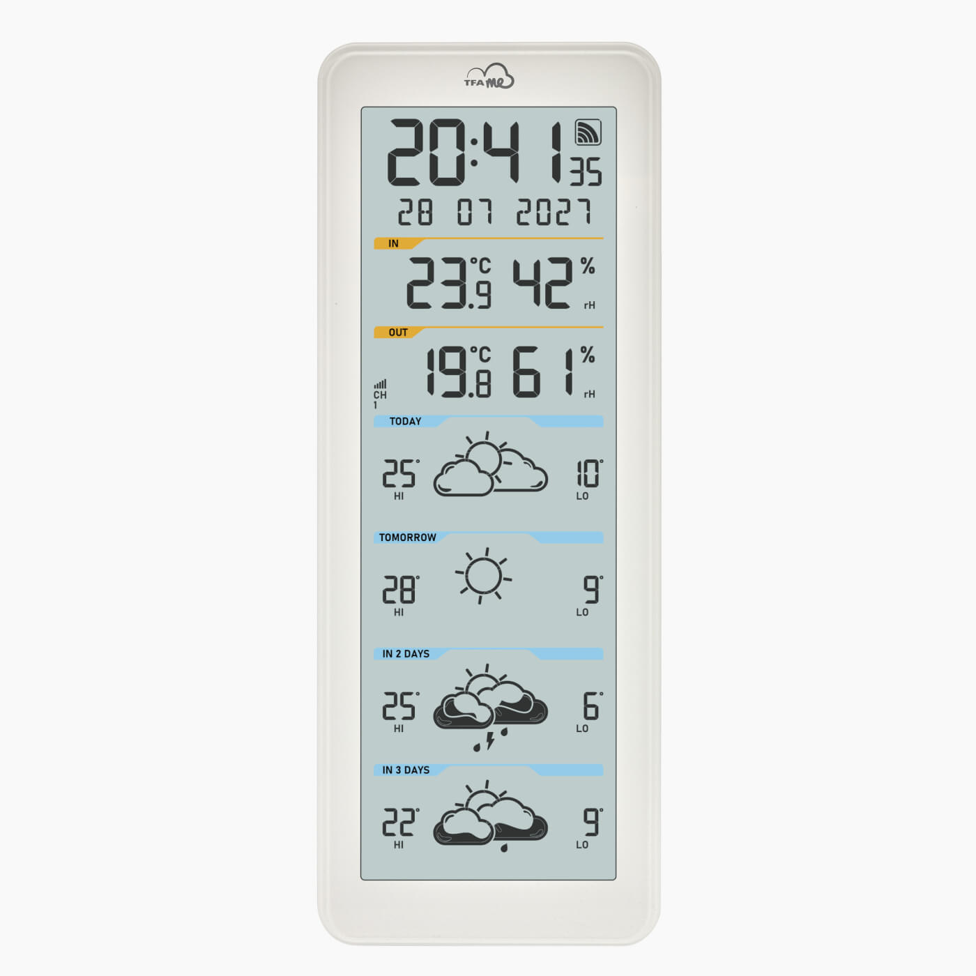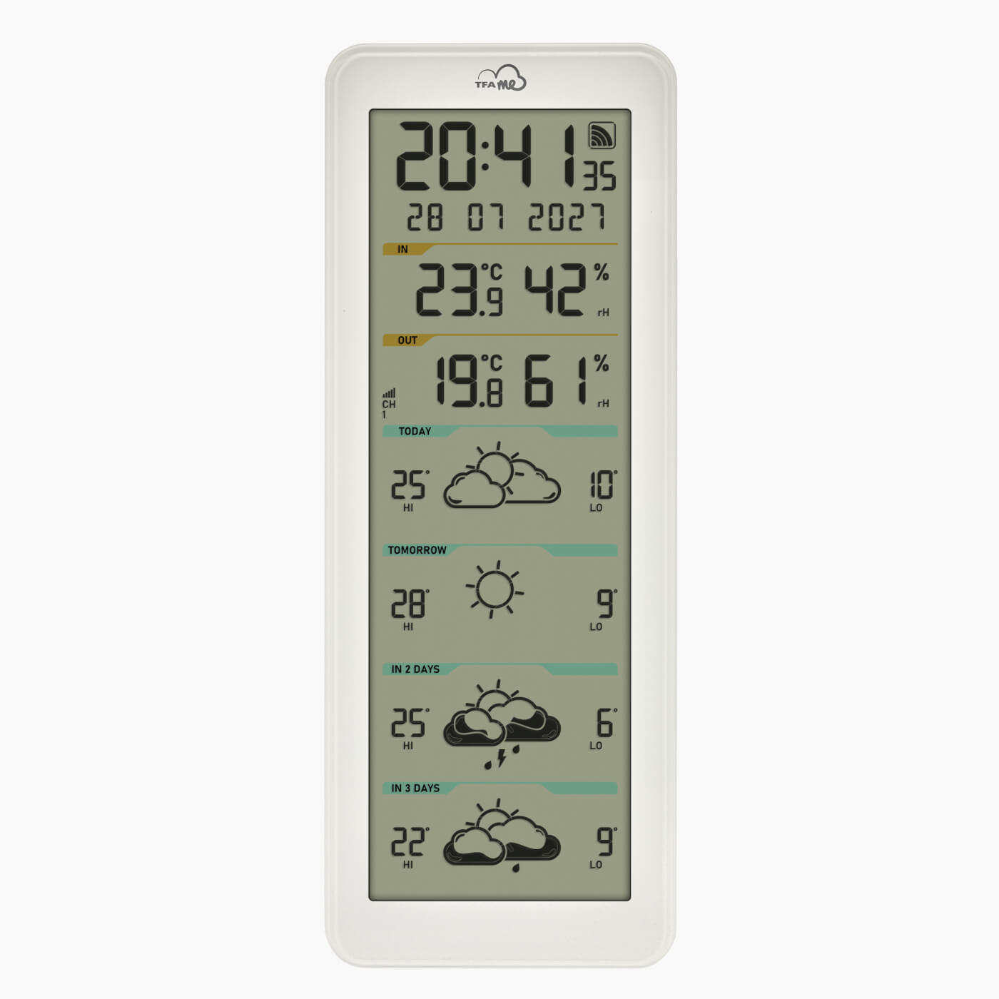 Jaké bude počasí? Bude jasno nebo zamračeno? Pokud potřebujete, aby vaše meteostanice zobrazovala skutečně profesionální předpověď počasí, systém TFA.ME je přesně pro vás. Tato meteostanice pravidelně stahuje z internetu přes WiFi kvalitní německou předpověď počasí ze serveru wetter.com.